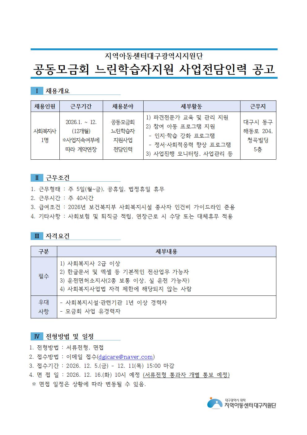 지역아동센터대구광역시지원단 공동모금회 느린학습자지원 사업전담인력 공고