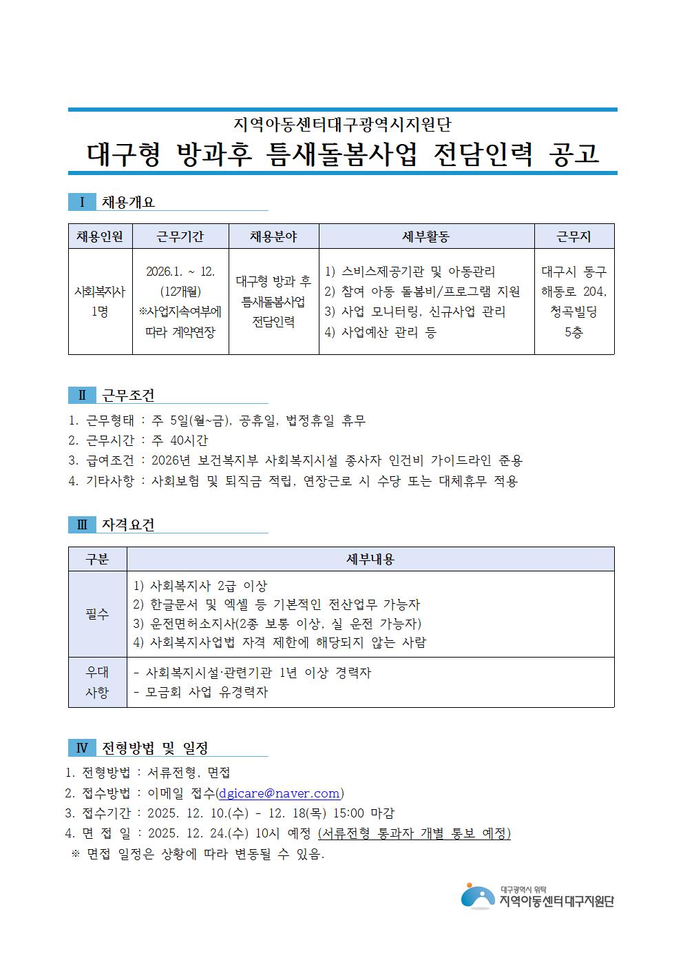 [긴급]2026년 지역아동센터 대구지원단 틈새돌봄사업 전담인력 채용공고 건